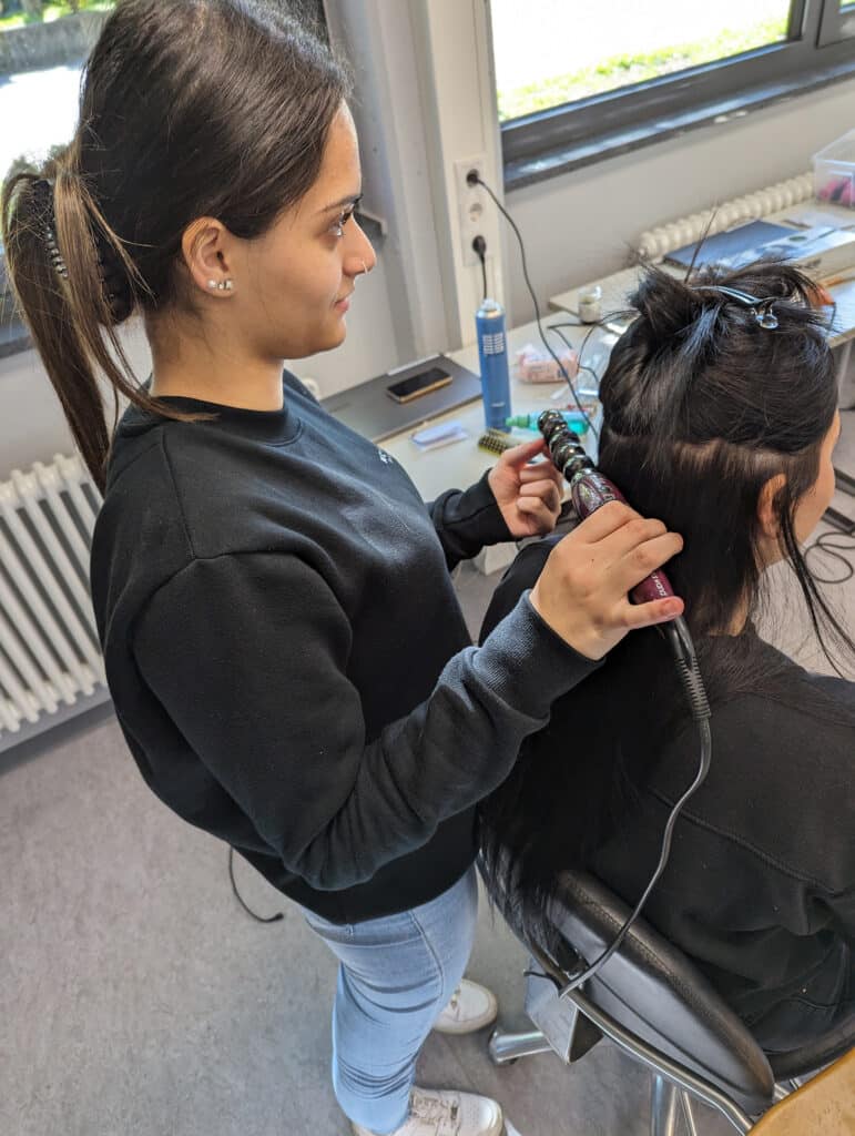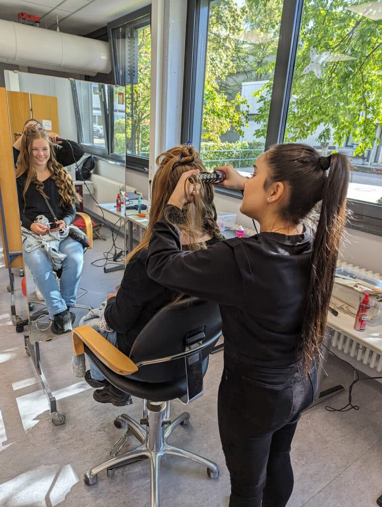 Die Schülerinnen und Schüler mit dem beruflichen Schwerpunkt ‚Körperpflege‘ (Friseur) verwöhnten unsere Gäste mit wunderschönen, lockigen Frisuren, bunten Fingernägeln, einem frischen Tages-Make-up und einer entspannten Handmassage.