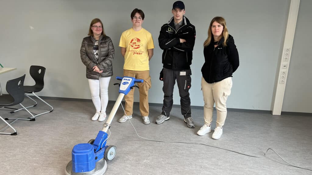 So gab es unter dem Titel „Mit Schwung zum Erfolg“ vier Stationen im Fachraum der Gebäudereiniger_innen: An der ersten Station konnte man einen „Führerschein“ mit einer Einscheibenmaschine erwerben. Für diese Reinigungs- und Poliermaschine musste man ein spezielles Geschick entwickeln um sie führen zu können. An der zweiten Station konnten die Interessierten lernen, wie man ebenso perfekt, schnell und schwungvoll wie die Profis die Fensterscheiben mit einem Abzieher reinigen kann. Station drei bot ein Quiz an, bei dem man Preise gewinnen konnte wenn man möglichst viele der fünf Holz- und Steinproben benennen konnte. Die vierte Station informierte über ie Rahmenbedingungen der Ausbildung sowie die vielfältigen und abwechslungsreichen Tätigkeitsgebiete. Hier berichteten die Azubis aus ihrem Ausbildungsalltag.