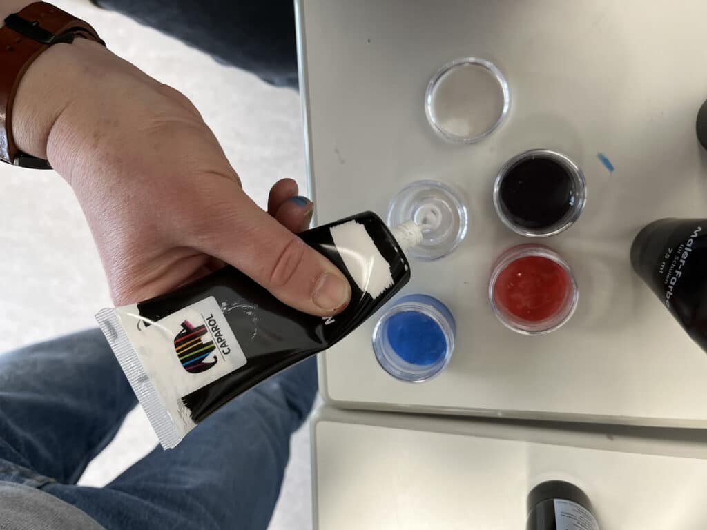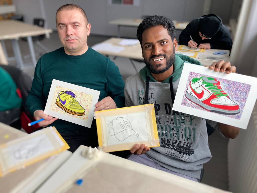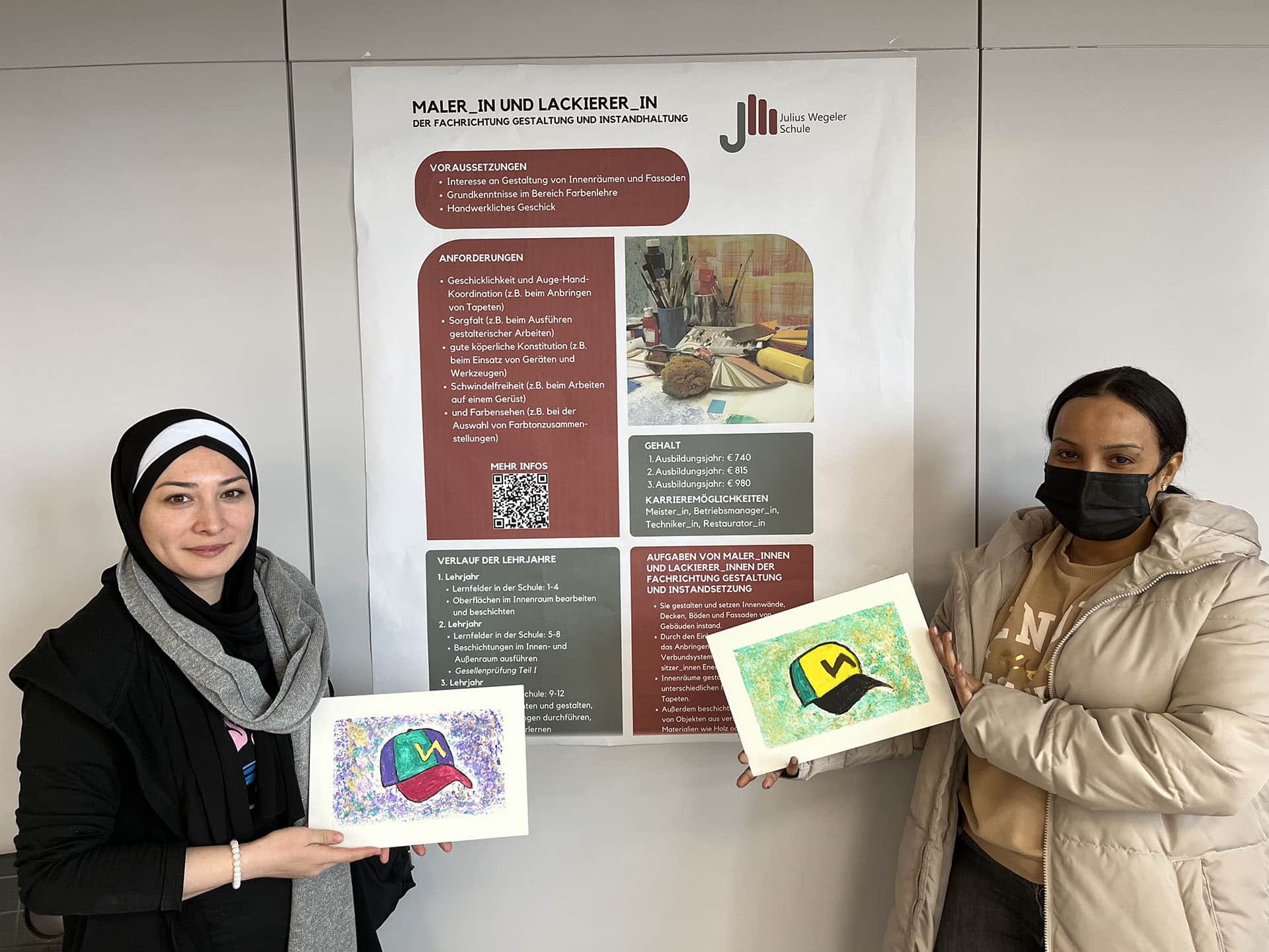 Die angehenden Maler- und Lackier_innen luden zur Übertragung und anschließenden farbigen Gestaltung eigener Motive auf Holzfaserplatten ein.