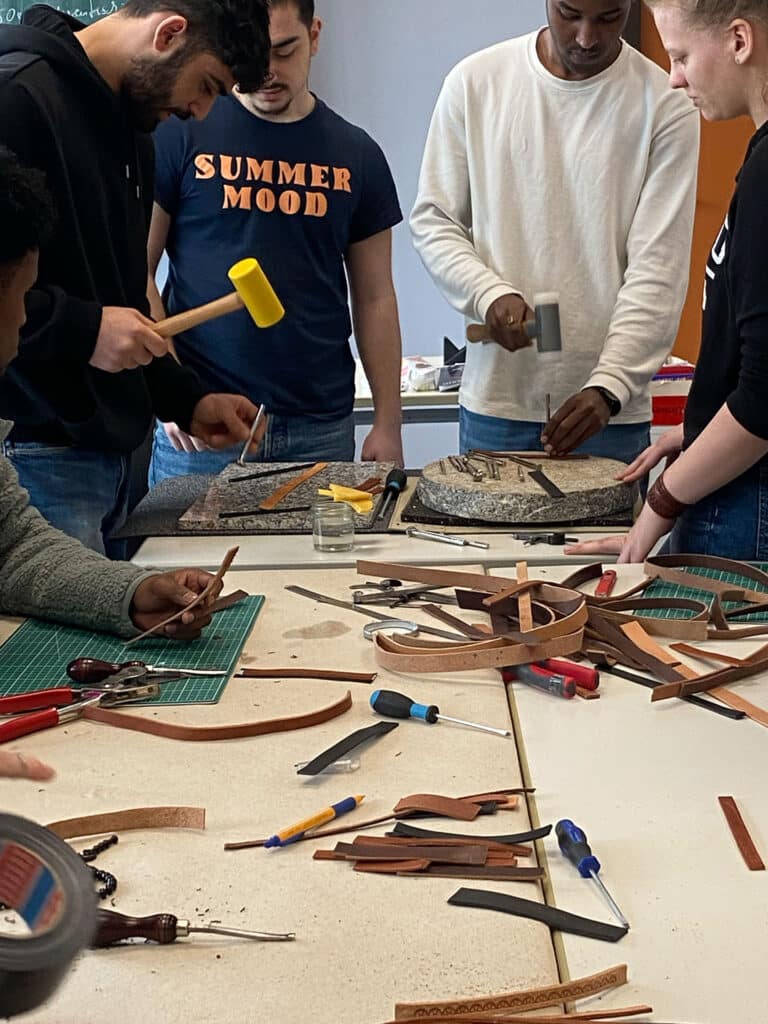 Dies veranschaulichte im kleinen Rahmen die alltägliche Arbeit mit Leder und gab den Besuchern ein Gefühl für die ungewohnten Materialien und Werkzeuge.